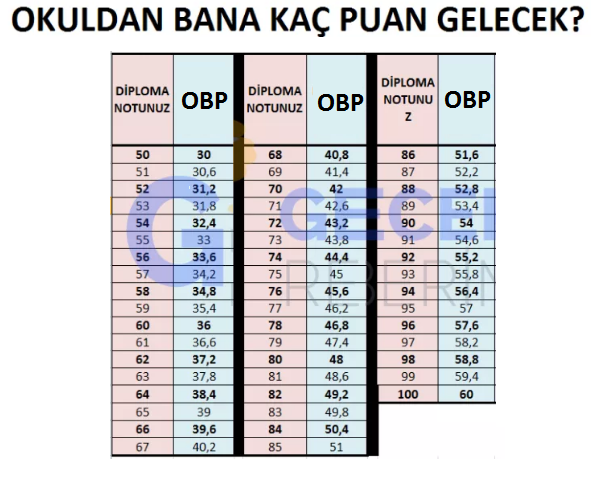 Lise boyunca elde ettiğiniz diploma puanlarının ortalamasının belirli bir katsayıya bölünmesi ile elde edilen puandır. Bu şekilde hesaplanan ortaöğretim başarı puanının yüzde onikisi (0,12) merkezî sınavdan alınan puana eklenerek adayın yerleştirme puanı hesaplanacaktır. Yks sonucuma obp etkisi nedir? Obp'ye etki eden diploma notu nasıl hesaplanır? Ortaöğretim başarı puanı, diploma notu, ösym puanı nedir?
